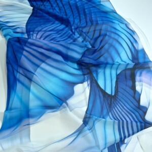 Light, airy and ethereal – these are the words that best describe the Large Square Wings Series 4 Silk Chiffon Scarf. The pattern evokes the image of angels spreading their wings and conquering the skies in the abstract sense, as strong as their wings yet as light as their feathers. The rhythmic patterns undulate like the wings of an angel in flight while the waves of blue color provide the eyes with a fascinating sight. No better gift to say “Take flight!” – perfect for graduation gifts, new jobs, or for anyone who you hope will soar in life! Wear as a shawl or a scarf.