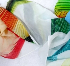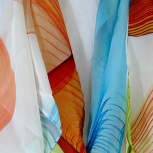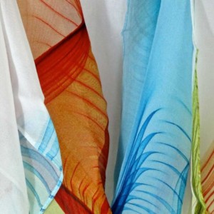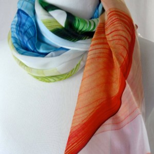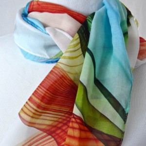 Digitally printed original design on 100% silk chiffon. Scarf measures approx. 70″ x 20″.