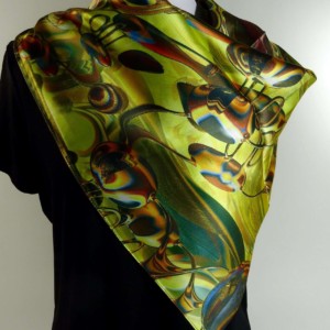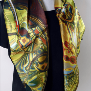 This beautiful scarf is based on my original fractal design, “Currents”. Swirls of golden yellow, teal, orange and brown on high-quality sillk. The design is digitally printed on silk satin, so it is stronger on the satin side but shows through beautifully almost as strong on the crepe side. Approx. 36″ square.