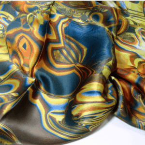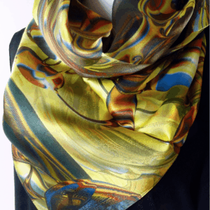 This beautiful scarf is based on my original fractal design, “Currents”. Swirls of golden yellow, teal, orange and brown on high-quality sillk. The design is digitally printed on silk satin, so it is stronger on the satin side but shows through beautifully almost as strong on the crepe side. Approx. 36″ square.