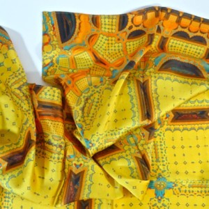 Bright orange, yellow and teal. Silk satin is shiny on one side, crepe finish on the other. Color is brightest on the shiny side, but also beautiful on the crepe side.