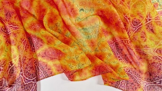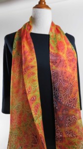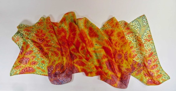 Digitally printed original design on 100% silk chiffon. Scarf measures approx. 70″ x 16″ (approx. 182cm x42cm). Machine hemmed. Dry clean only. Iron on medium or cool – no steam.