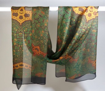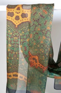 Intricate fractal beauty on silk chiffon in subtle shades of rust, gold and green! This lovely, long shawl/scarf recalls the complexity of Islamic art. Length is 78 inches, long enough to knot and wrap almost any way you wish.
